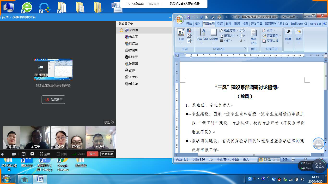 2020年4月20日,仪器系召开了“校风、教风、学风”三风建设研讨会,系全体教师及王生怀经理参加了研讨,会议由孙海明主持。