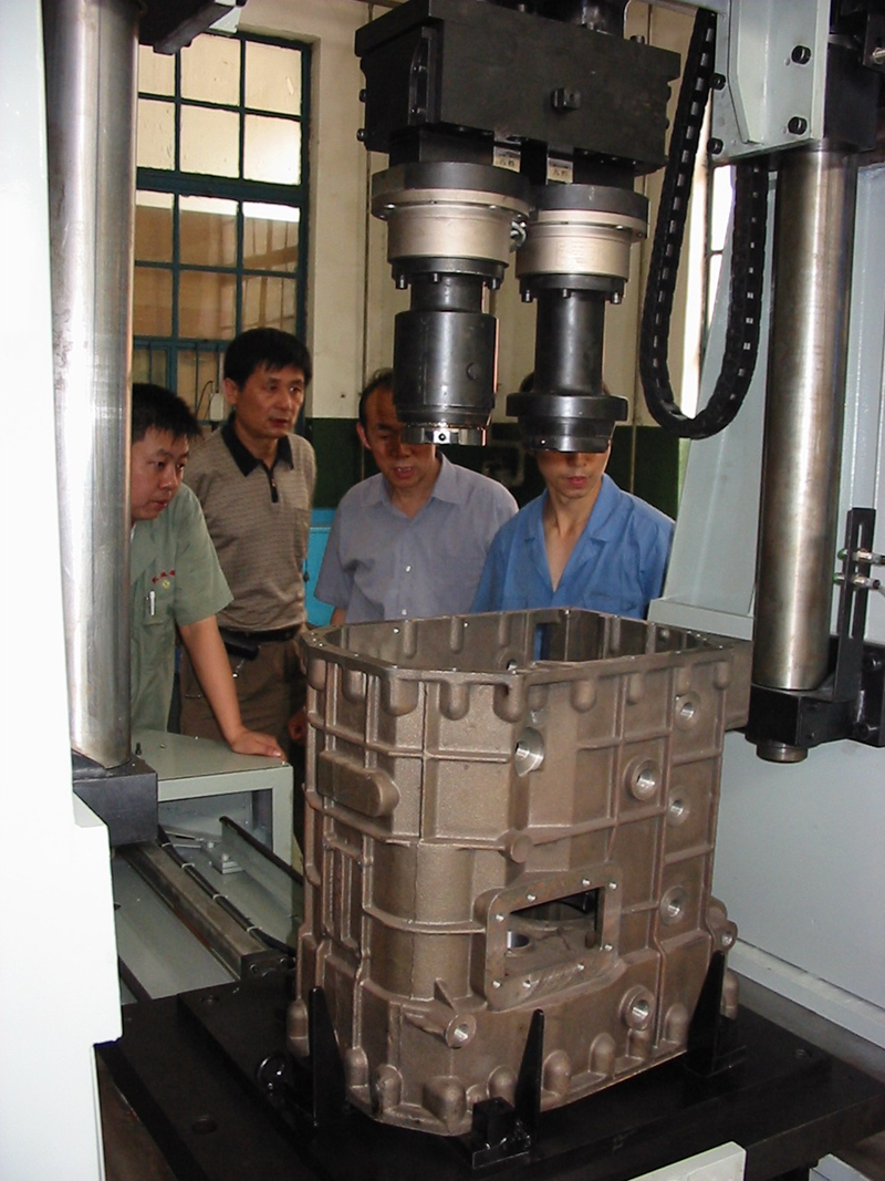 汽车变速箱是汽车传动系统的重要总成,装配过程中需要将支撑传动轴的圆锥滚子轴承外圈先装配到壳体上,装配精度直接影响到变速箱的性能优劣。东风汽车变速箱公司因没有专用设备,主要靠手工进行装配。人工手锤敲击装配对轴承外圈的损伤较大且受力不均匀,装配精度低,质量得不到保证,导致客户索赔率高;同时,工人敲击装配费时费力,劳动强度较大,噪声污染严重,箱体内安装致使工人手臂经常受伤,对工人的身心健康造成一定影响,也影响了周围的环境。该公司为适应企业发展的需要,决定进行轴承压装设备研发项目招标。我们和来自重庆、苏州等五家公司参与了竞标,最终以技术优胜中标,并于2008年5月签订中标合同。接着立即成立了由汽院罗敏、龚青山、尹绥玉、张友兵、王荣志、张光国、吴岳敏,变速箱公司王勇、刘红广、刘勇、鲍伟、周金禾等参加的“中心偏差自适应轴承轴套并联压装机”项目组,我任组长。根据项目合同技术协议要求,压装机结构设计主要由压头总成、夹紧装置、升降台、移动工作台、机架、操作面板及测控系统等几部分组成;压装过程由控制系统自动控制完成,压头总成中间安装压力测量和偏差修正装置;压头可快速更换,能实现单头、双头压装。图3为东风汽车变速箱公司设备工程师在现场查验压装机设备。
