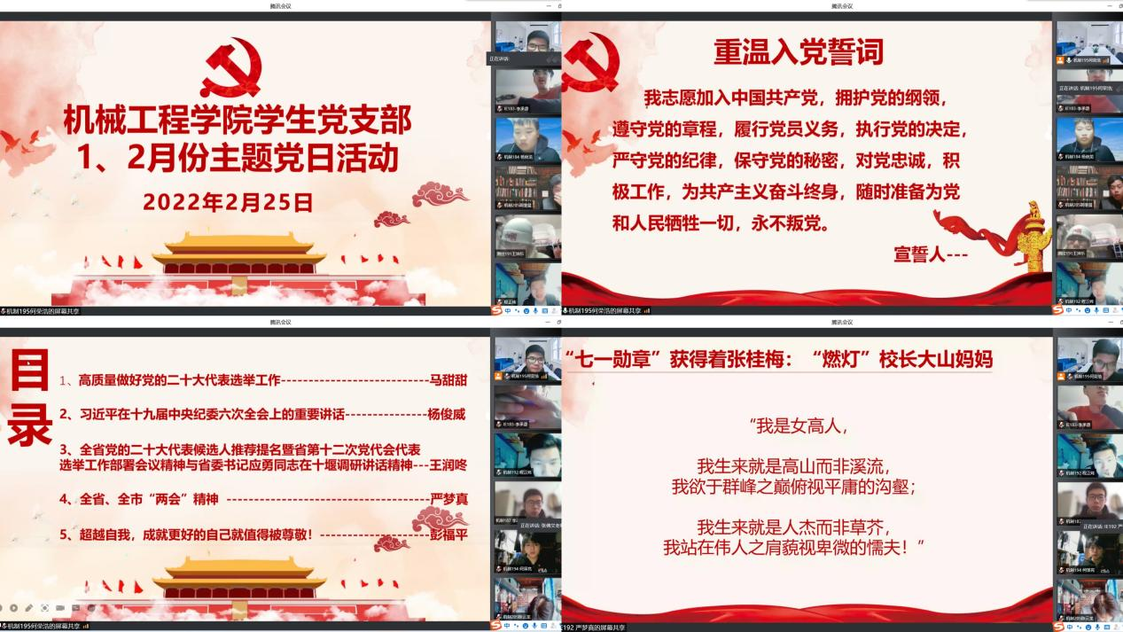2月25日中午12:30,太阳成集团122cc官网入口员工党支部在腾讯会议线上组织开展1、2月份主题党日活动。学院员工党员一支部书记何理、二支部书记张倩文以及全体员工党员、发展对象、入党积极分子参加学习。会议由员工党员何荣浩主持。
